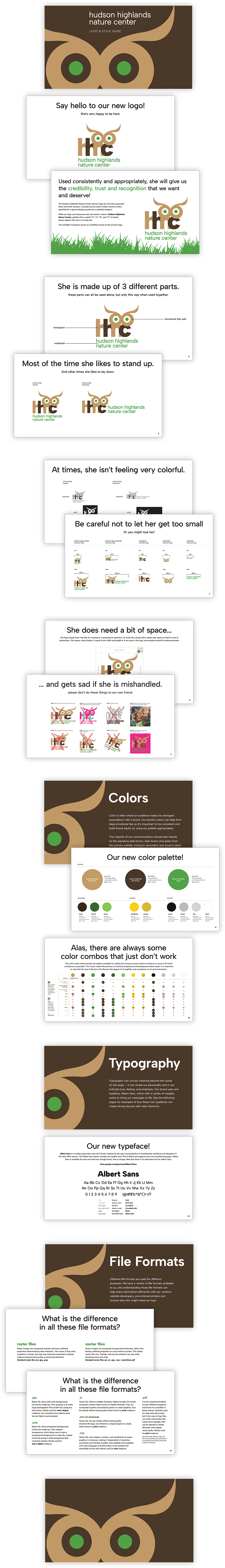 The Hudson Highlands Nature Center was undergoing a logo refresh and mini rebrand. While a style guide wasn’t part of the original request, I believe that whenever you create a logo for an organization, providing guidance is key to setting them up for success. I created a comprehensive style guide outlining the new fonts, colors, typography standards, and best practices for file usage and consistency.