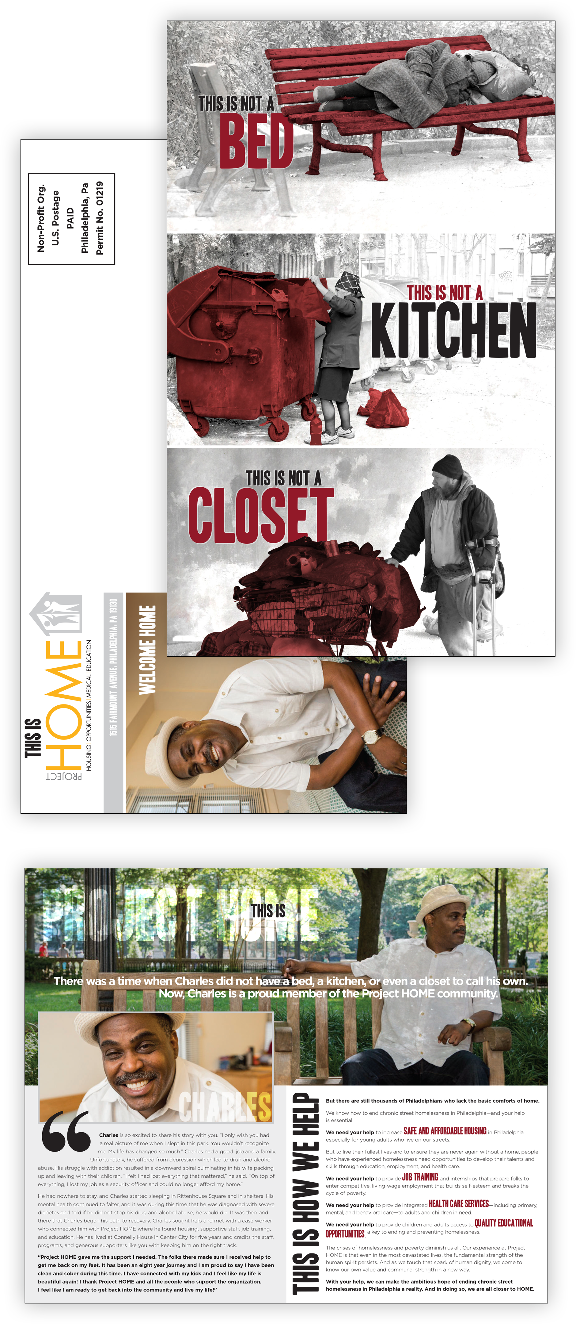 These oversized mailers were created for Project HOME to stand out within crowded mailboxes and encourage recipients to engage beyond the initial glance. Large, dramatic imagery on the exterior created immediate visual impact and drew viewers into the interior messaging, where the full story and call to action unfolded.