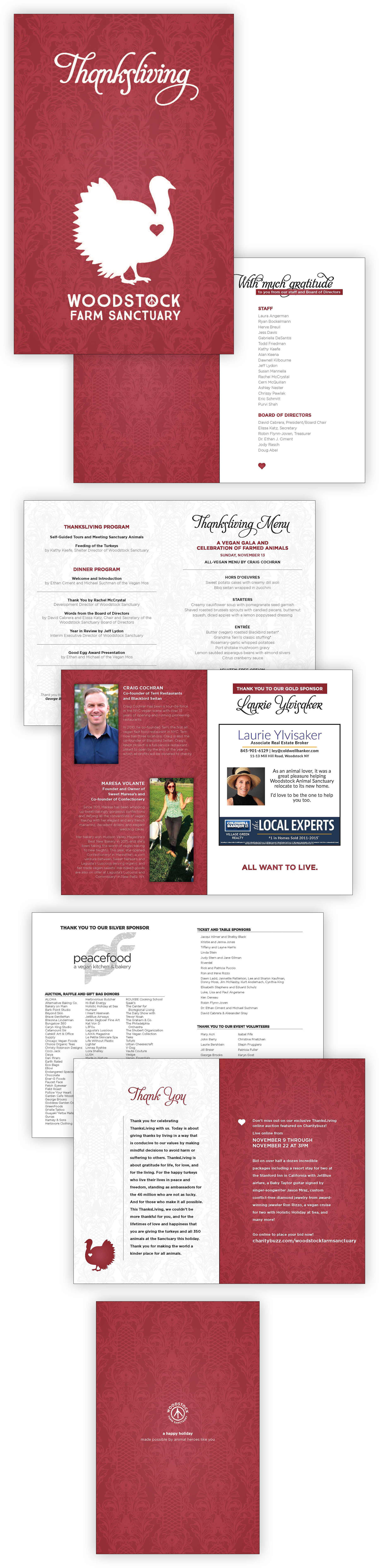 This multi-panel program for Woodstock Farm Sanctuary’s ThanksLiving fundraiser balanced warmth and celebration with clear, functional design. A rich patterned red palette established a sense of tradition, while clean layouts and thoughtful typography kept schedules, menus, sponsors, and acknowledgments easy to navigate. Subtle graphic elements, including the turkey silhouette and small heart detail, reinforced the sanctuary’s compassionate mission without overwhelming the content. Strong hierarchy and consistent visual language guided readers naturally through the program, creating a cohesive piece that feels polished, respectful, and easy to engage with.